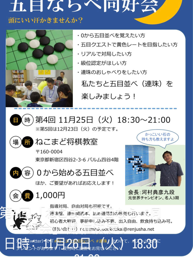 2025年 11月25日 東日本 イベント ねこまど五目ならべ同好会 開催日時 2025年11月25日(火) 18:30 - 2025年8月26日(火) 21:00 場所 ねこまど将棋教室 参加費 1,000円 参加資格 誰でも参加可能 備考 一緒に五目並べ(連珠)を楽しみましょう! クリックして X で共有 (新しいウィンドウで開きます) X Facebook で共有するにはクリックしてください (新しいウィンドウで開きます) Facebook
