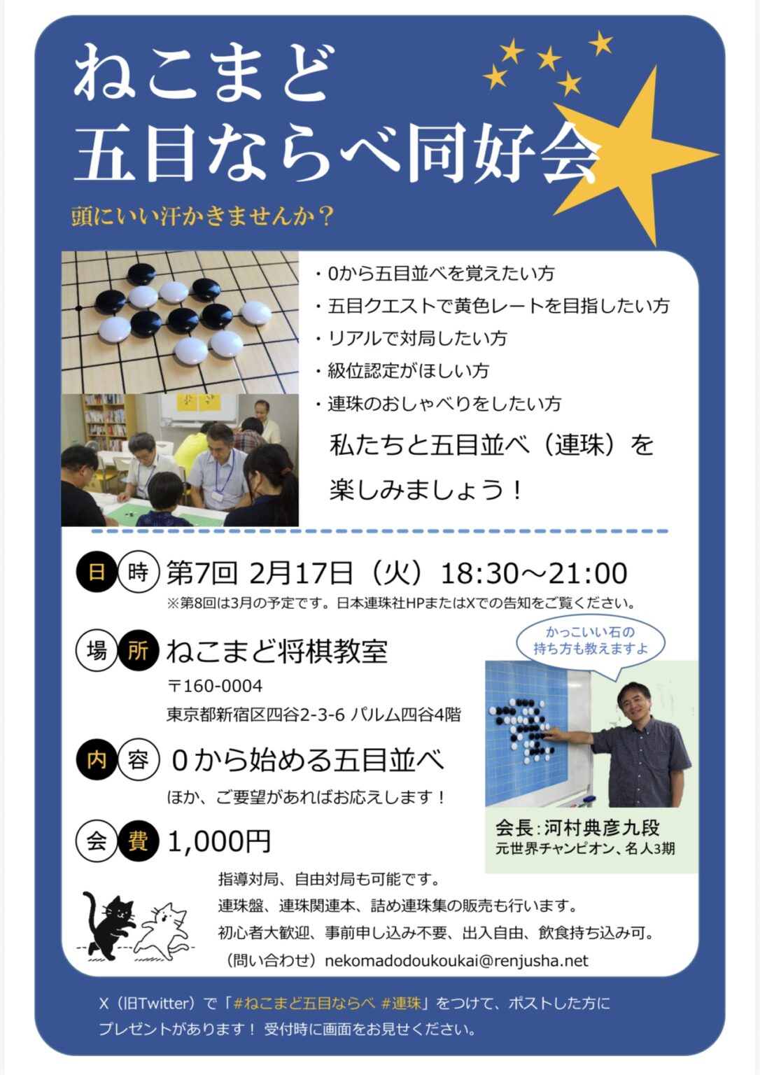 2026年 2月17日 東日本 イベント ねこまど五目ならべ同好会 開催日時 2026年2月17日(火) 18:30 - 2025年8月26日(火) 21:00 場所 ねこまど将棋教室 参加費 1,000円 参加資格 誰でも参加可能 備考 一緒に五目並べ(連珠)を楽しみましょう! クリックして X で共有 (新しいウィンドウで開きます) X Facebook で共有するにはクリックしてください (新しいウィンドウで開きます) Facebook