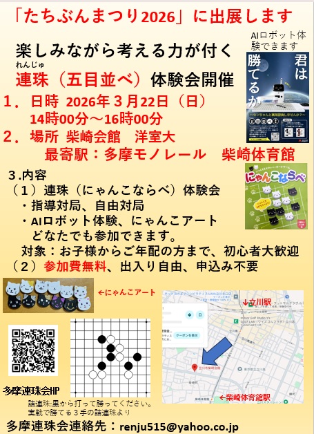 2026年 3月22日 東日本 イベント 多摩連珠会 たちぶんまつり出展(2026年3月) 開催日時 2026年3月22日(日) 13:00 - 16:00 場所 柴崎会館 洋間大 〒190-0023 東京都立川市柴崎町1丁目16−3 https://www.city.tachikawa.lg.jp/shisetsu/1008071/1008256.html 参加費 無料 参加資格 誰でも参加可能 X で共有 (新しいウィンドウで開きます) X Facebook で共有 (新しいウィンドウで開きます) Facebook