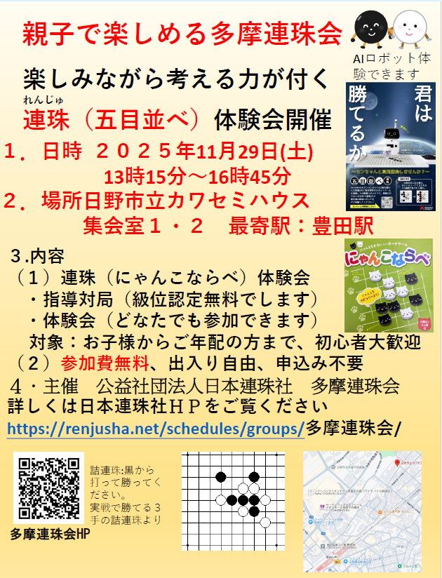 2025年 11月29日 東日本 イベント 多摩連珠会 連珠体験会(2025年11月) 開催日時 2025年11月29日(土) 13:15 - 16:45 場所 カワセミハウス 東京都日野市東豊田3-26-1 https://www.city.hino.lg.jp/kawasemihouse/1016733/1016855.html 参加費 無料 参加資格 誰でも参加可能 初心者大歓迎です。参加費無料。みんあで連珠(五目並べを楽しみましょう) クリックして X で共有 (新しいウィンドウで開きます) X Facebook で共有するにはクリックしてください (新しいウィンドウで開きます) Facebook