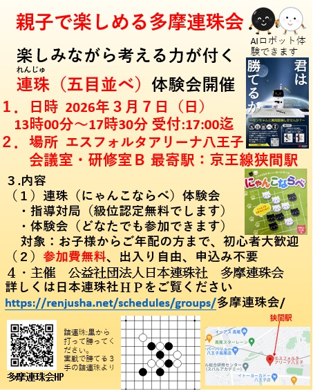 2026年 3月7日 東日本 イベント 多摩連珠会 連珠体験会(2026年3月)エスフォルタアリーナ八王子 開催日時 2026年3月7日(土) 13:15 - 16:45 場所 エスフォルタアリーナ八王子 東京都八王子市狭間町1453番の1 https://www.hachioji.esforta.jp/ 参加費 無料 出入り自由 参加資格 誰でも参加可能 X で共有 (新しいウィンドウで開きます) X Facebook で共有 (新しいウィンドウで開きます) Facebook